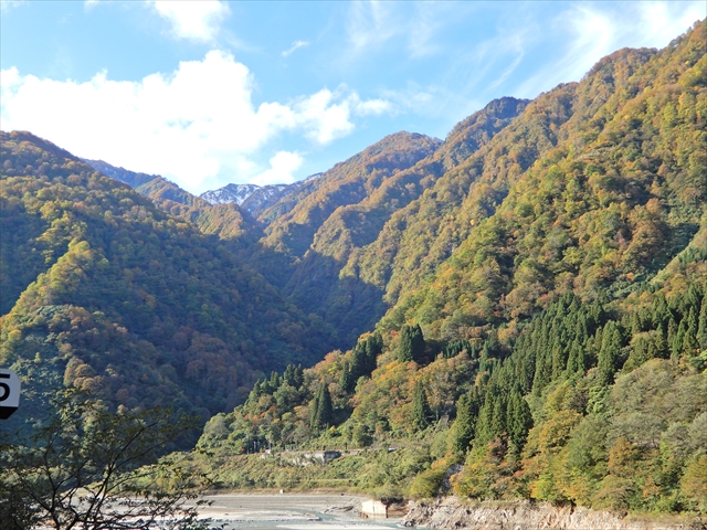 宇奈月ダムから見ると、山の頂上付近は雪が積もっており、